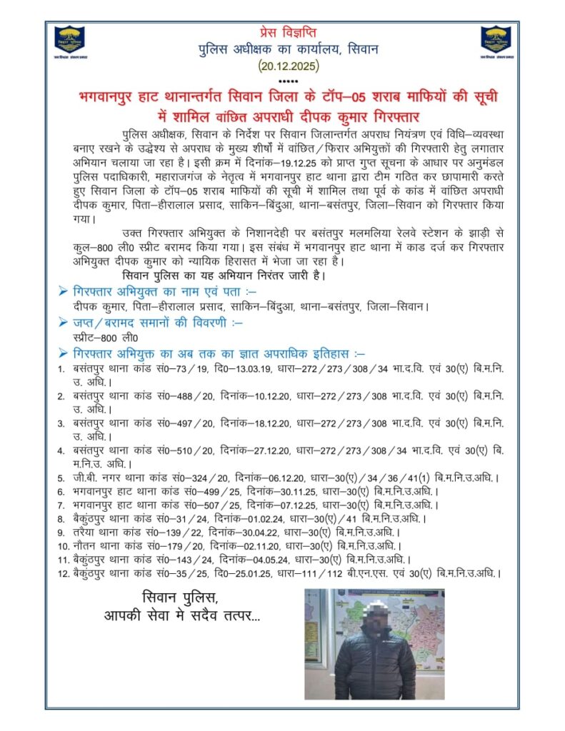 पुलिस अधीक्षक, सिवान विक्रम सिहाग के निर्देश पर जिले में अपराध नियंत्रण और विधि-व्यवस्था बनाए रखने के उद्देश्य से फरार और वांछित अपराधियों की गिरफ्तारी के लिए लगातार विशेष अभियान चलाया जा रहा है। इसी क्रम में 19 दिसंबर 2025 को प्राप्त गुप्त सूचना के आधार पर अनुमंडल पुलिस पदाधिकारी, महाराजगंज के नेतृत्व में भगवानपुर हाट थाना की टीम गठित की गई। टीम ने त्वरित कार्रवाई करते हुए छापेमारी की और वांछित शराब माफिया दीपक कुमार को दबोच लिया।