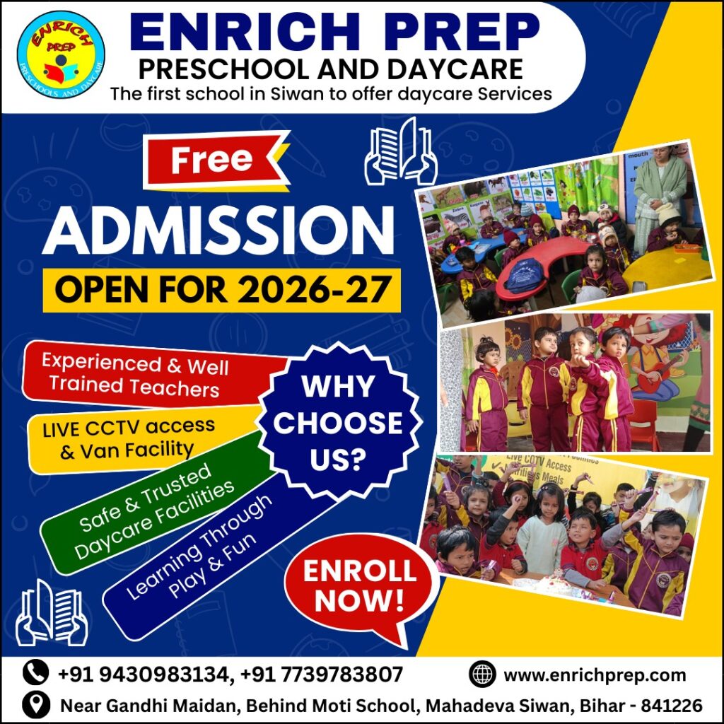 जिला मुख्यालय स्थित गांधी मैदान के पास मोती स्कूल के पीछे संचालित एनरिच प्रेप प्रीस्कूल एंड डे केयर नन्हे बच्चों की प्रारंभिक शिक्षा का भरोसेमंद केंद्र बनता जा रहा है। 3 मार्च 2025 से शुरू हुआ यह संस्थान शिक्षा को मजेदार बनाते हुए बच्चों के उज्ज्वल भविष्य की मजबूत नींव तैयार करने में जुटा है। https://youtu.be/eM9EjAii_mQ?si=CYlXvNLp0UDcYC9S