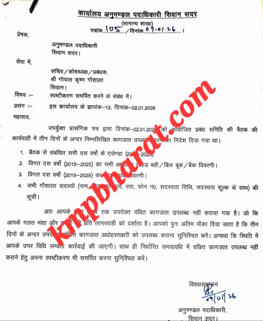09 जनवरी को जारी पत्र में एसडीओ ने स्पष्ट शब्दों में उल्लेख किया था कि बार-बार निर्देश के बावजूद कागजात उपलब्ध नहीं कराना प्रबंधन की गलत मंशा और कार्यों के प्रति लापरवाही को दर्शाता है। इसी के साथ गौशाला प्रबंधन को तीन दिनों का अंतिम मौका देते हुए चेतावनी दी गई थी कि तय समय के भीतर कागजात और स्पष्टीकरण नहीं देने पर विधि सम्मत कार्रवाई की जाएगी।