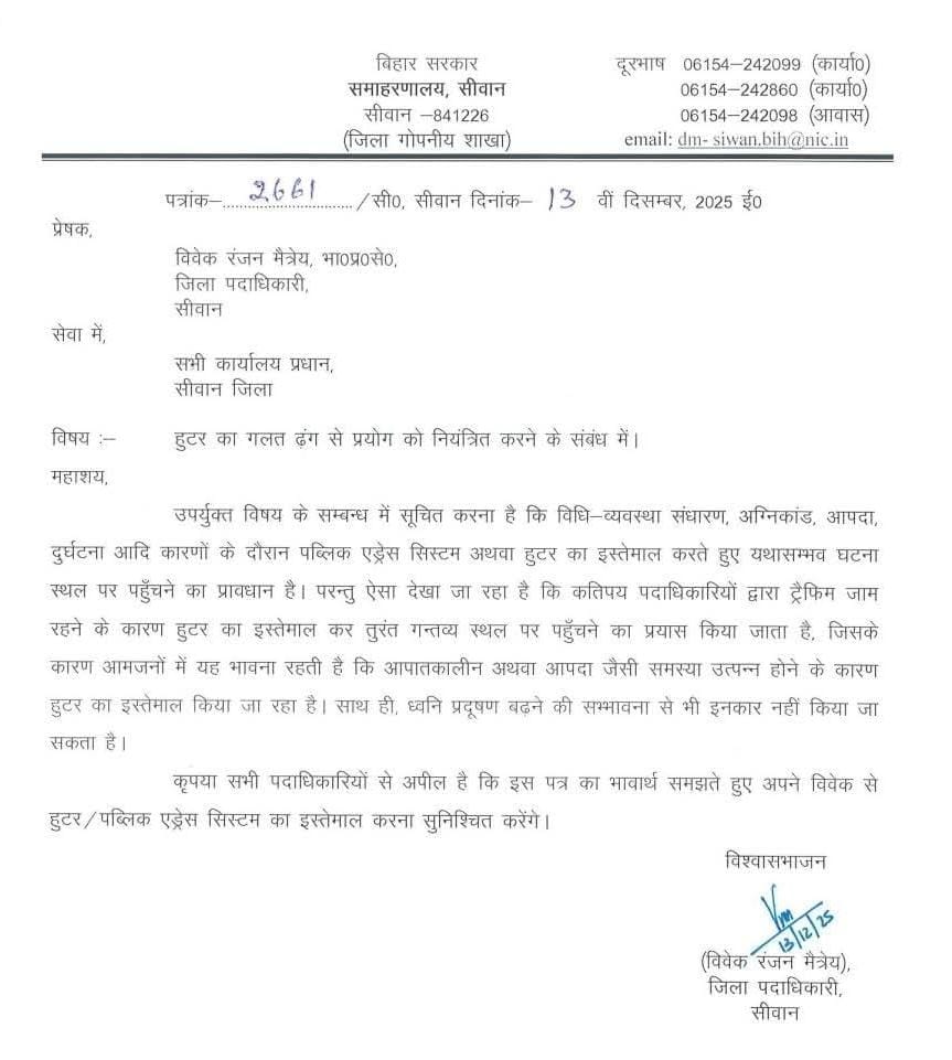 जिले में सरकारी गाड़ियों में लगे हूटर और पब्लिक एड्रेस सिस्टम के गलत इस्तेमाल को लेकर जिला प्रशासन सख्त हो गया है। जिला पदाधिकारी विवेक रंजन मैत्रेय ने इस संबंध में जिले के सभी कार्यालय प्रधानों को स्पष्ट निर्देश जारी किए हैं। आदेश में कहा गया है कि हूटर का प्रयोग केवल विधि-व्यवस्था संधारण, अग्निकांड, आपदा, दुर्घटना अथवा अन्य वास्तविक आपात स्थितियों में ही किया जाए।