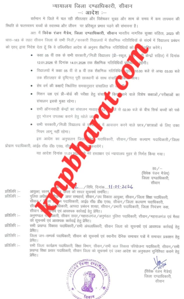 सीवान जिले में जारी कड़ाके की ठंड और शीतलहर को देखते हुए जिला प्रशासन ने बच्चों की सुरक्षा के मद्देनजर बड़ा फैसला लिया है। जिला दण्डाधिकारी विवेक रंजन मैत्रेय ने भारतीय नागरिक सुरक्षा संहिता, 2023 की धारा-163 के तहत आदेश जारी करते हुए जिले के सभी सरकारी और निजी विद्यालयों की शैक्षणिक गतिविधियों में अस्थायी बदलाव किया है।