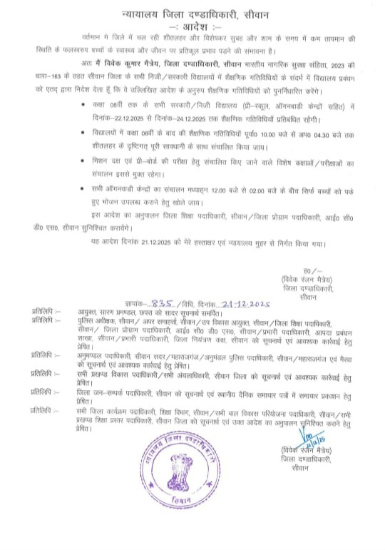 सीवान जिले में लगातार बढ़ रही शीतलहर और सुबह–शाम अत्यधिक ठंड को देखते हुए जिला प्रशासन ने बड़ा फैसला लिया है। जिला दंडाधिकारी विवेक रंजन मैत्रेय ने भारतीय नागरिक सुरक्षा संहिता, 2023 की धारा 163 के तहत आदेश जारी करते हुए जिले के सभी सरकारी और निजी विद्यालयों में शैक्षणिक गतिविधियों को आंशिक रूप से प्रतिबंधित कर दिया है।