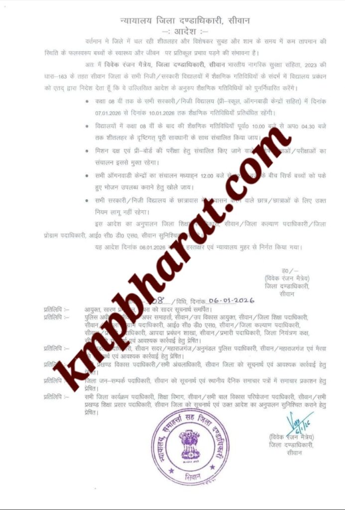 सीवान। जिले में लगातार बढ़ रही शीतलहर और सुबह–शाम अत्यधिक ठंड को देखते हुए जिला प्रशासन ने बच्चों के स्वास्थ्य को प्राथमिकता देते हुए बड़ा निर्णय लिया है। जिला दण्डाधिकारी विवेक रंजन मैत्रेय ने भारतीय नागरिक सुरक्षा संहिता, 2023 की धारा 163 के तहत आदेश जारी कर कक्षा 8वीं तक के सभी सरकारी और निजी विद्यालयों में शैक्षणिक गतिविधियों पर अस्थायी रोक लगा दी है।