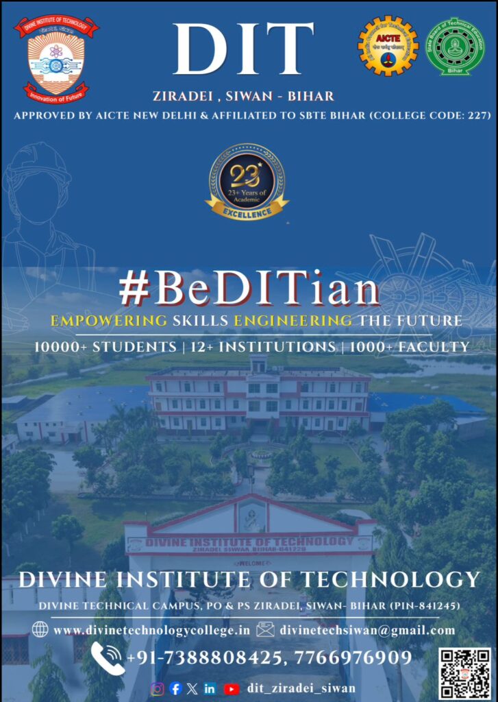 जिले के जीरादेई स्थित डिवाइन इंस्टीट्यूट ऑफ टेक्नोलॉजी में शैक्षणिक सत्र 2026-27 के लिए नामांकन प्रक्रिया शुरू हो गई है। संस्थान की ओर से डिप्लोमा इन मैकेनिकल, इलेक्ट्रिकल, कंप्यूटर साइंस और सिविल इंजीनियरिंग कोर्स में प्रवेश के लिए आवेदन आमंत्रित किए गए हैं। संस्थान प्रबंधन का दावा है कि यहां छात्रों को आधुनिक तकनीकी शिक्षा के साथ-साथ रोजगारोन्मुख प्रशिक्षण भी दिया जाता है, जिससे वे भविष्य की चुनौतियों के लिए तैयार हो सकें। https://youtu.be/FntLYACY5Go?si=A7ZLvISZnoYXyi4N