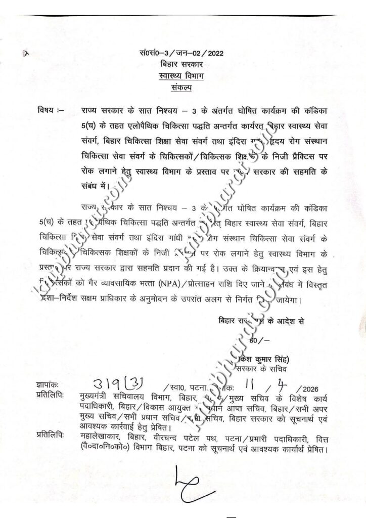 यह आदेश बिहार स्वास्थ्य सेवा संवर्ग, बिहार चिकित्सा शिक्षा सेवा संवर्ग और इंदिरा गांधी हृदय रोग संस्थान चिकित्सा सेवा संवर्ग के चिकित्सकों व चिकित्सक शिक्षकों पर लागू होगा