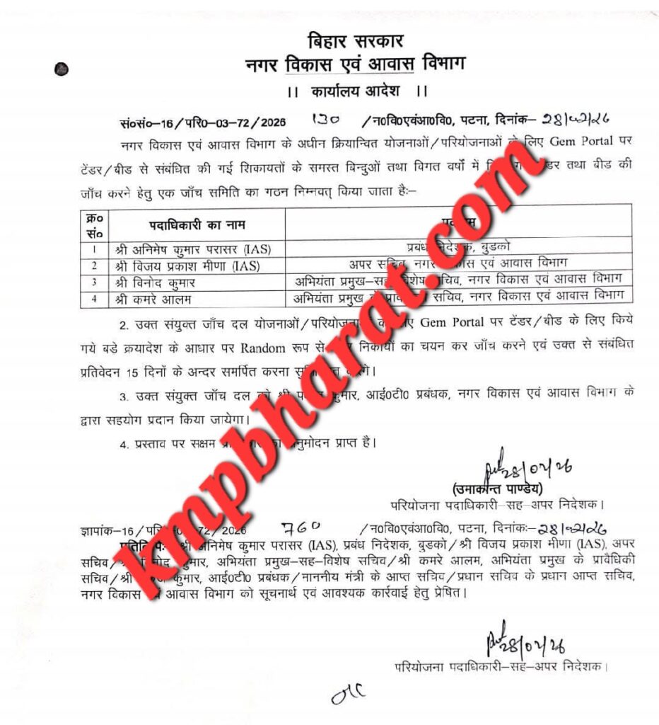 नगर विकास एवं आवास विभाग की योजनाओं और परियोजनाओं में पारदर्शिता सुनिश्चित करने की दिशा में बिहार सरकार ने एक महत्वपूर्ण कदम उठाया है। विभाग ने GEM (Government e-Marketplace) पोर्टल के माध्यम से जारी टेंडर और बीड से संबंधित शिकायतों की जांच के लिए उच्चस्तरीय संयुक्त जांच समिति का गठन किया है। यह समिति न केवल प्राप्त शिकायतों की जांच करेगी, बल्कि विगत वर्षों में जारी टेंडर और बीड की प्रक्रिया की भी समीक्षा करेगी।
