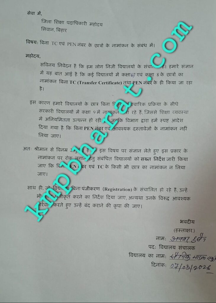 उन्होंने यह भी मांग की है कि सरकारी विद्यालयों में कक्षा 9 में नामांकन के दौरान ट्रांसफर सर्टिफिकेट और PEN नंबर को अनिवार्य किया जाए। बिना इन दस्तावेजों के किसी भी छात्र का नामांकन नहीं लिया जाना चाहिए, ताकि शिक्षा व्यवस्था में पारदर्शिता और अनुशासन बना रहे।