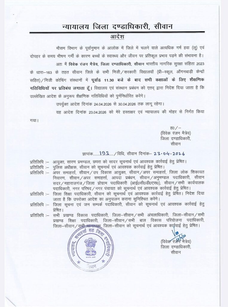 सीवान जिले में लगातार बढ़ती गर्मी और लू के प्रकोप को देखते हुए जिला प्रशासन ने बड़ा निर्णय लिया है। जिला दण्डाधिकारी विवेक रंजन मैत्रेय ने भारतीय नागरिक सुरक्षा संहिता 2023 की धारा-163 के तहत आदेश जारी करते हुए जिले के सभी सरकारी और निजी विद्यालयों, प्री-स्कूल, आंगनबाड़ी केंद्रों और निजी कोचिंग संस्थानों में दोपहर 11:30 बजे के बाद शैक्षणिक गतिविधियों पर पूर्ण प्रतिबंध लगा दिया है।