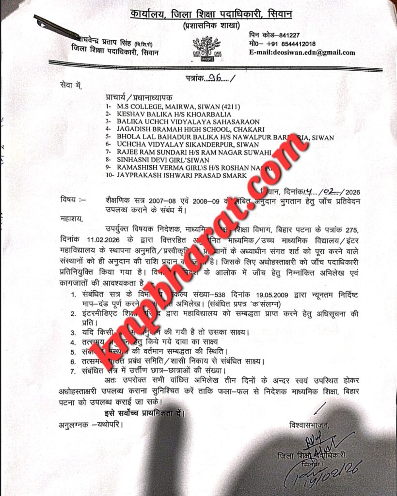 सिवान जिले के वित्तरहित माध्यमिक एवं उच्च माध्यमिक विद्यालयों को मिले अनुदान की प्रक्रिया अब जांच के घेरे में आ गई है। जिला शिक्षा पदाधिकारी राघवेन्द्र प्रताप सिंह ने शैक्षणिक सत्र 2007-08 एवं 2008-09 के लंबित अनुदान भुगतान से जुड़े मामलों की जांच शुरू कर दी है। इस संबंध में जिले के 10 विद्यालयों और एक इंटर कॉलेज से विस्तृत अभिलेख मांगे गए हैं।
