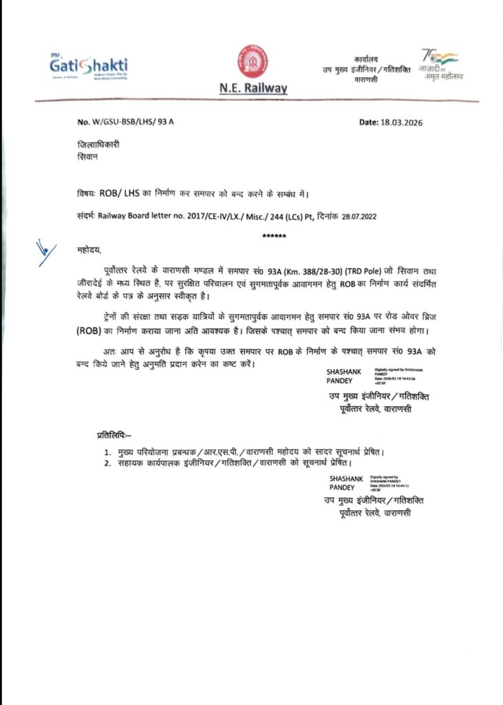 रेलवे बोर्ड के निर्देश के अनुसार इस समपार पर ROB का निर्माण किया जाएगा, जिससे रेल और सड़क यातायात दोनों को सुरक्षित और सुगम बनाया जा सके। नॉर्थ ईस्टर्न रेलवे ने जिला प्रशासन से अनुरोध किया है कि ROB निर्माण के बाद समपार संख्या 96 को बंद करने की अनुमति दी जाए, ताकि ट्रेन संचालन पूरी तरह बाधारहित हो सके।