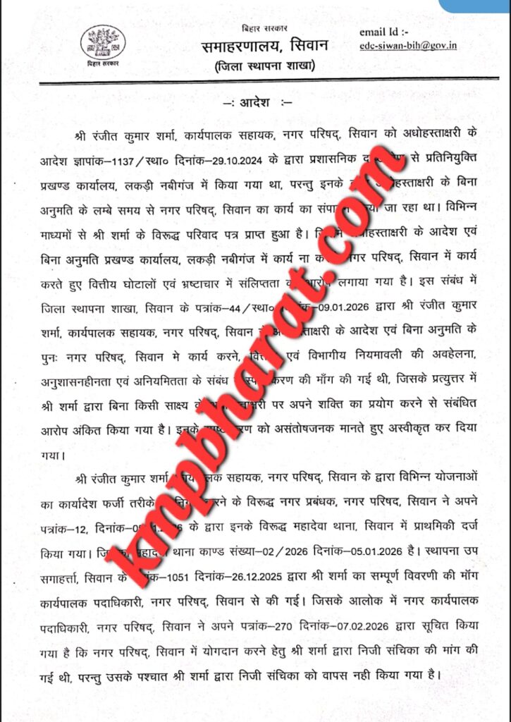 जिला स्थापना शाखा से जारी आदेश के अनुसार, रंजीत कुमार शर्मा को 29 अक्टूबर 2024 को प्रशासनिक दृष्टिकोण से नगर परिषद, सिवान से प्रखंड कार्यालय लकड़ी नबीगंज में प्रतिनियुक्त किया गया था। लेकिन आरोप है कि उन्होंने बिना अनुमति के लंबे समय तक नगर परिषद में ही कार्य करना जारी रखा। इस दौरान उनके विरुद्ध विभिन्न माध्यमों से शिकायतें प्राप्त हुईं, जिनमें वित्तीय घोटाले और भ्रष्टाचार में संलिप्तता जैसे गंभीर आरोप शामिल थे।