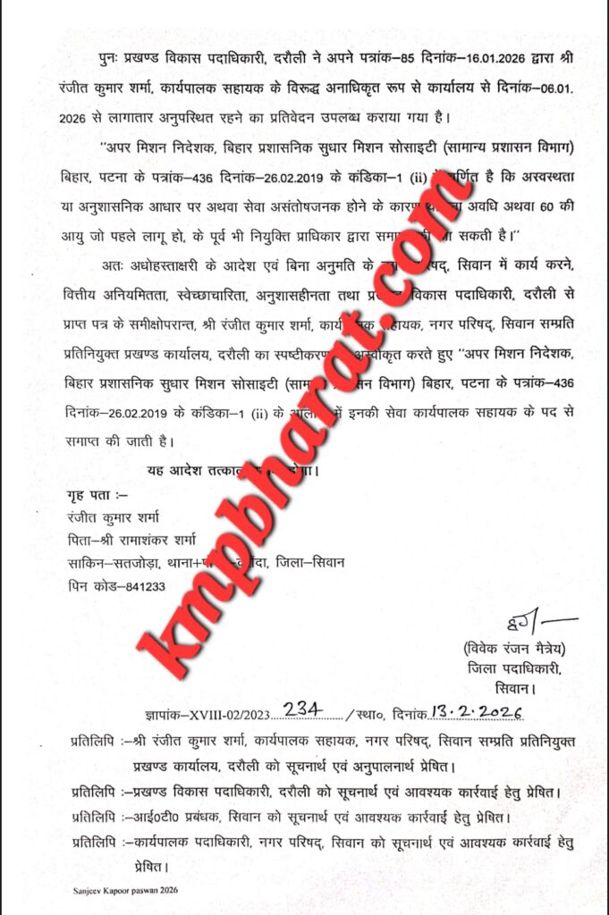 उधर, प्रखंड विकास पदाधिकारी, दरौली ने भी 16 जनवरी 2026 को रिपोर्ट भेजकर बताया कि रंजीत कुमार शर्मा 6 जनवरी 2026 से लगातार बिना अनुमति के कार्यालय से अनुपस्थित हैं।