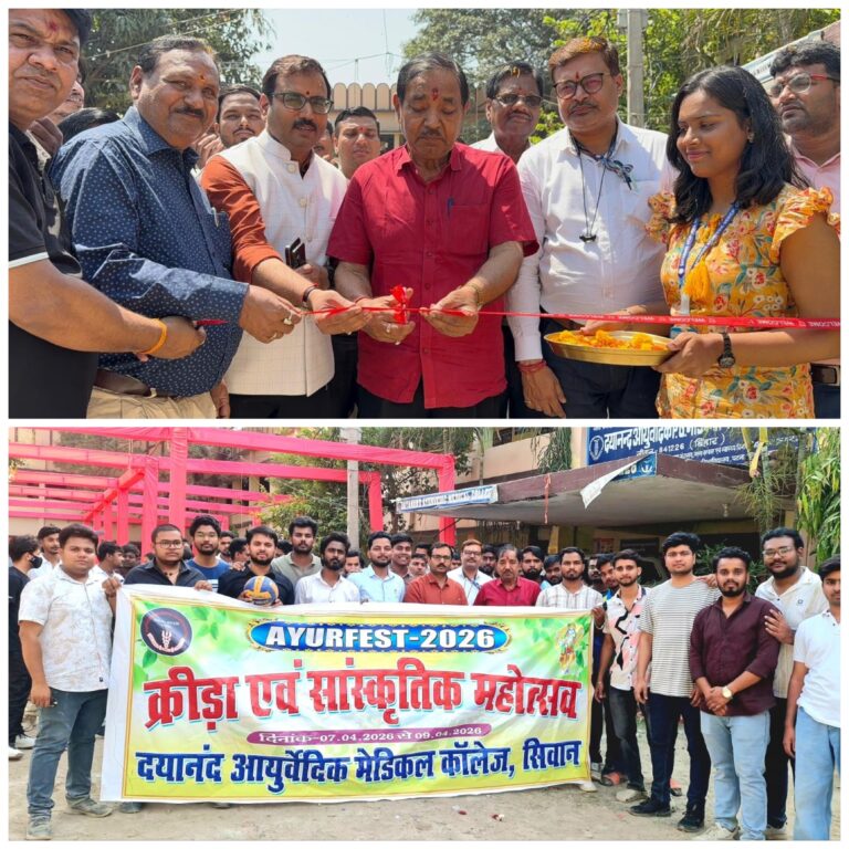 दयानन्द आयुर्वेदिक मेडिकल कॉलेज एवं अस्पताल, सिवान में तीन दिवसीय “क्रीड़ा एवं सांस्कृतिक महोत्सव – AYURFEST-2026” का मंगलवार को भव्य शुभारंभ हुआ। कार्यक्रम का उद्घाटन महाविद्यालय के पूर्व प्राचार्य एवं शासी निकाय के सलाहकार डॉ. प्रजापति त्रिपाठी, प्राचार्य डॉ. सुधांशु शेखर त्रिपाठी एवं उपप्राचार्य डॉ. राजा प्रसाद ने संयुक्त रूप से फीता काटकर किया। इसके पश्चात राष्ट्रगान के साथ महोत्सव की औपचारिक शुरुआत हुई।