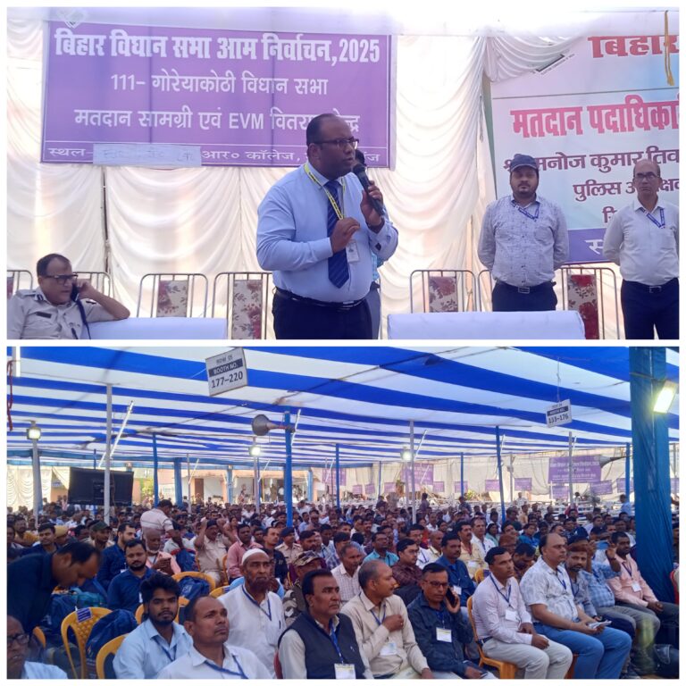 महाराजगंज (सीवान) | बिहार विधानसभा चुनाव 2025 के प्रथम चरण में 6 नवम्बर को मतदान होना है। इसे लेकर मंगलवार को अनुमंडल मुख्यालय स्थित स्वामी कर्मदेव यमुना राम उच्च विद्यालय सह इंटर कॉलेज परिसर में गोरियाकोठी (111) और महाराजगंज (112) विधानसभा क्षेत्रों के मतदानकर्मियों एवं सुरक्षा बलों को अंतिम प्रशिक्षण दिया गया।