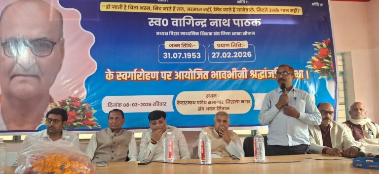 बिहार माध्यमिक शिक्षक संघ, सिवान के निवर्तमान जिला अध्यक्ष स्वर्गीय वागींद्र नाथ पाठक के स्वर्गारोहण पर रविवार को केदारनाथ पाण्डेय सभागार, निराला नगर स्थित संघ भवन में श्रद्धांजलि सभा का आयोजन किया गया। कार्यक्रम में बड़ी संख्या में शिक्षक, शिक्षाविद् और सामाजिक कार्यकर्ता उपस्थित होकर दिवंगत शिक्षक नेता को भावभीनी श्रद्धांजलि अर्पित की।