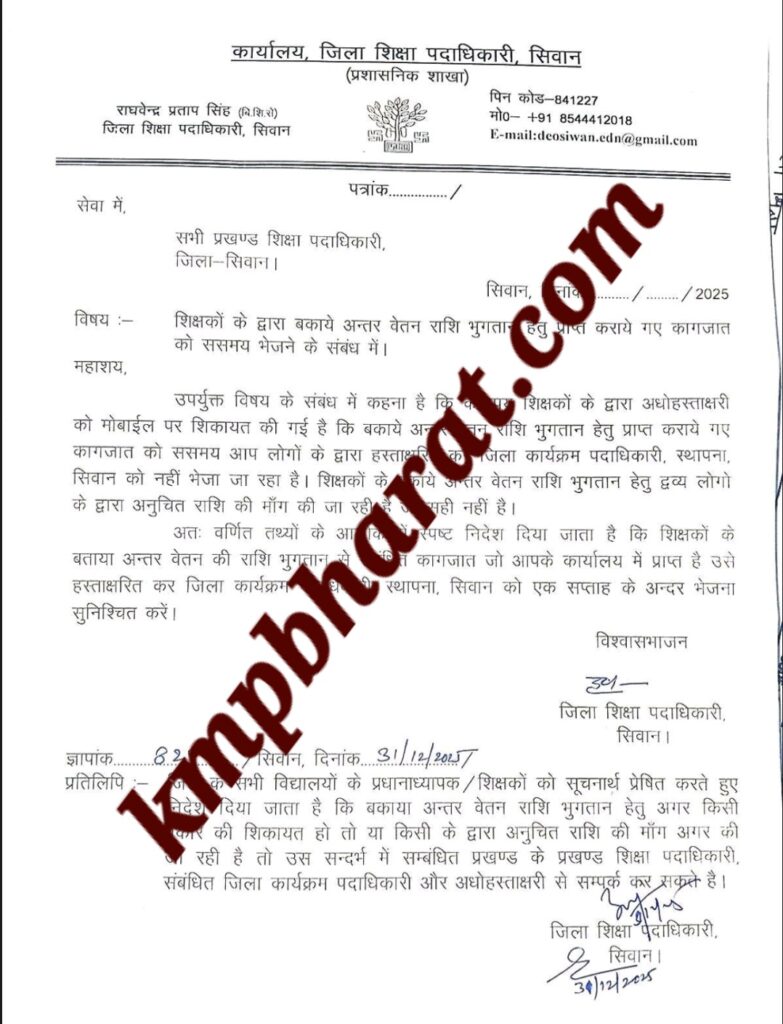 वहीं, इस आदेश की प्रतिलिपि जिले के सभी विद्यालयों के प्रधानाध्यापकों और शिक्षकों को भी भेजी गई है। शिक्षकों को निर्देश दिया गया है कि यदि अंतर वेतन भुगतान को लेकर किसी भी प्रकार की समस्या हो या किसी अधिकारी/कर्मचारी द्वारा अवैध राशि की मांग की जाए, तो वे सीधे संबंधित प्रखंड शिक्षा पदाधिकारी, जिला कार्यक्रम पदाधिकारी अथवा जिला शिक्षा पदाधिकारी से संपर्क कर सकते हैं।