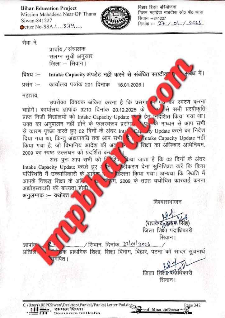बिहार शिक्षा परियोजना, समग्र शिक्षा (SSA) के अंतर्गत कार्यालय पत्रांक 201 दिनांक 16.01.2026 के आलोक में यह कार्रवाई की गई है। इससे पूर्व 20 दिसंबर 2025 को सभी मान्यता प्राप्त निजी विद्यालयों को निर्देश दिया गया था कि वे अपनी Intake Capacity ऑनलाइन अपडेट करें, लेकिन बड़ी संख्या में विद्यालयों ने इसका अनुपालन नहीं किया।